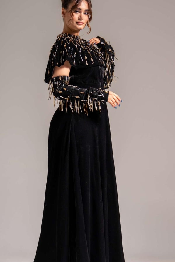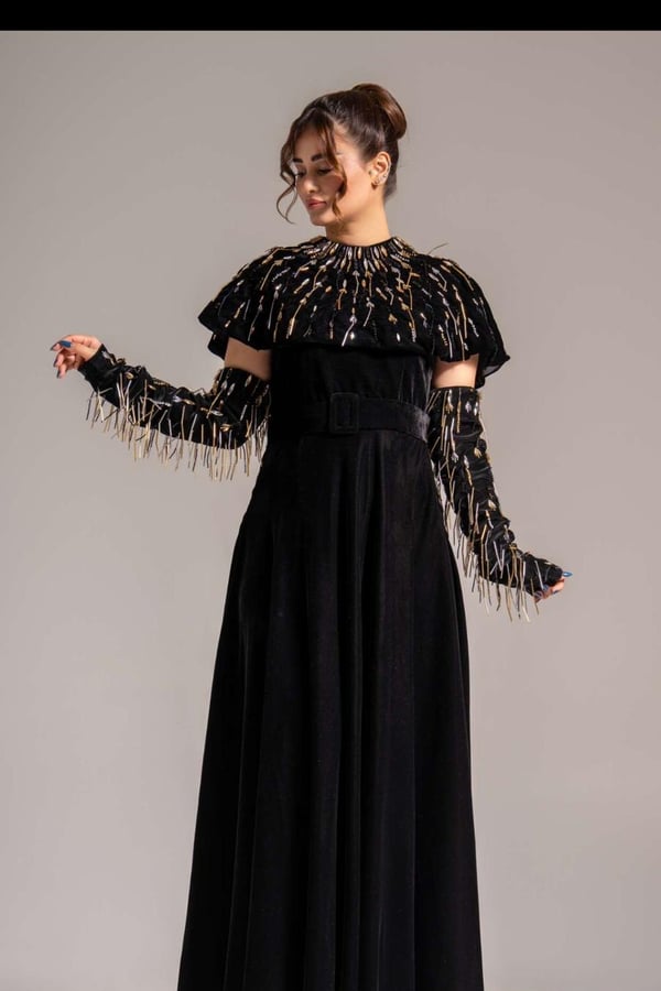 3-piece model consisting of gloves, a dress and a high neck embroidered with crystals