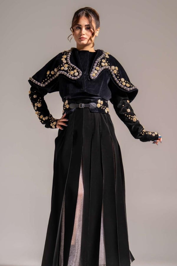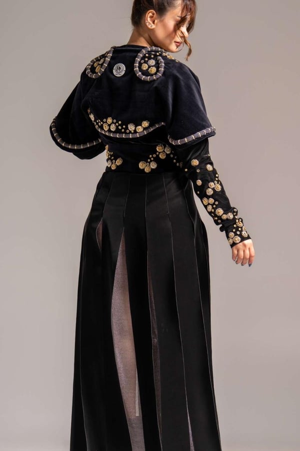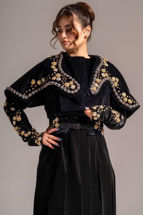 Nude blazer with black velvet embro...