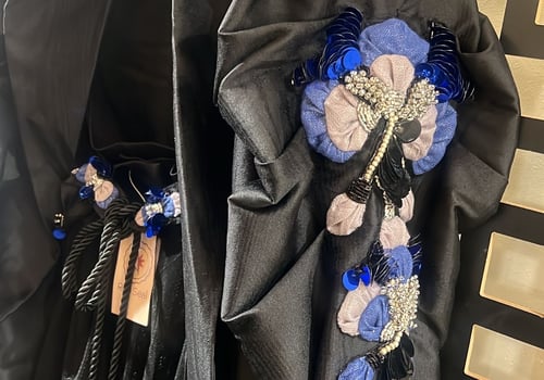A 3-piece suit with an embroidered blazer belt on the sleeves, black pants, and a tulle skirt