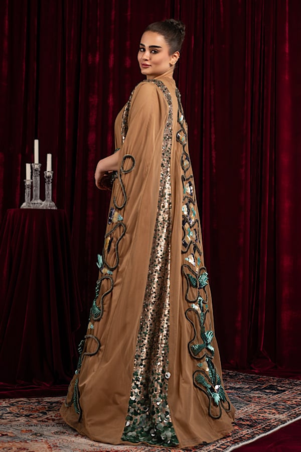 A cape with unique patterns on the front and back and a wide embroidered belt bieg coler