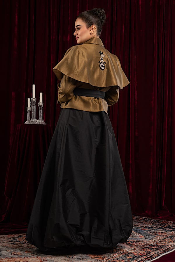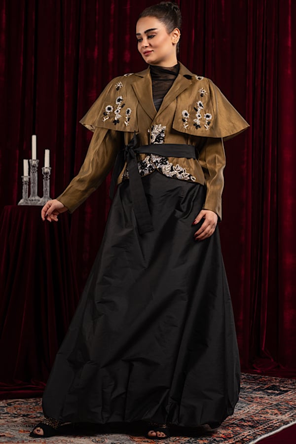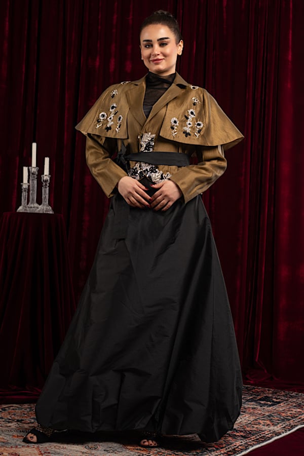 A cropped jacket embroidered with unique patterns and a wide, puffy skirt.