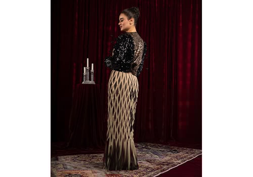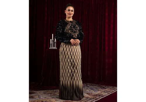 A cropped jacket with sequins, prominent feathers, and unique patterns on the chest, paired with a skirt featuring new cuts.