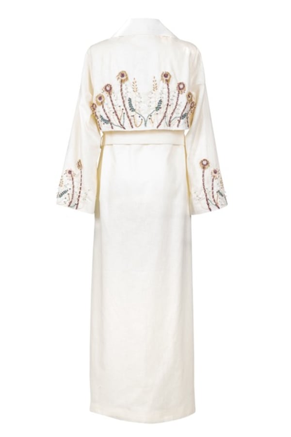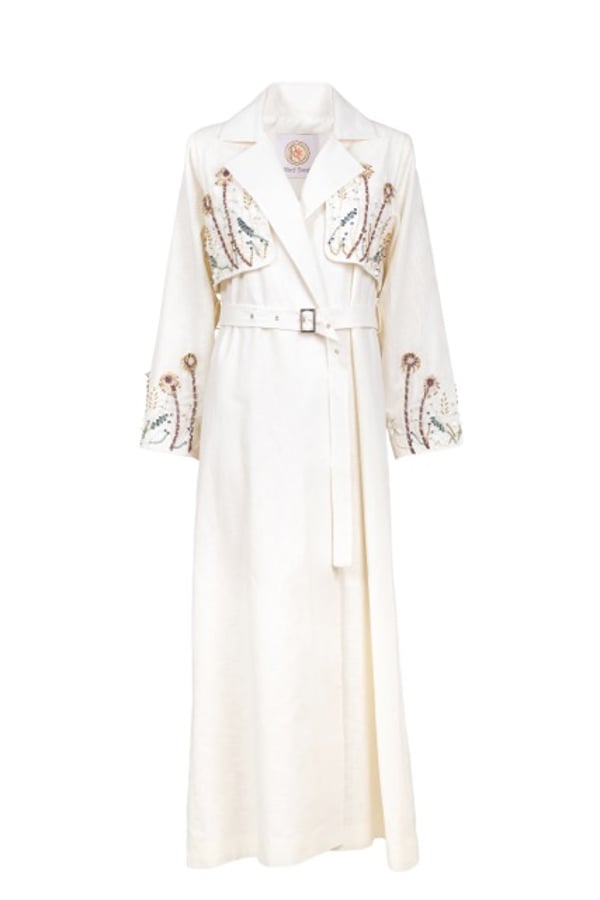 A long blazer embroidered with beads on the front, back and sleeves in linen fabric