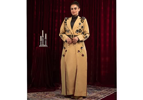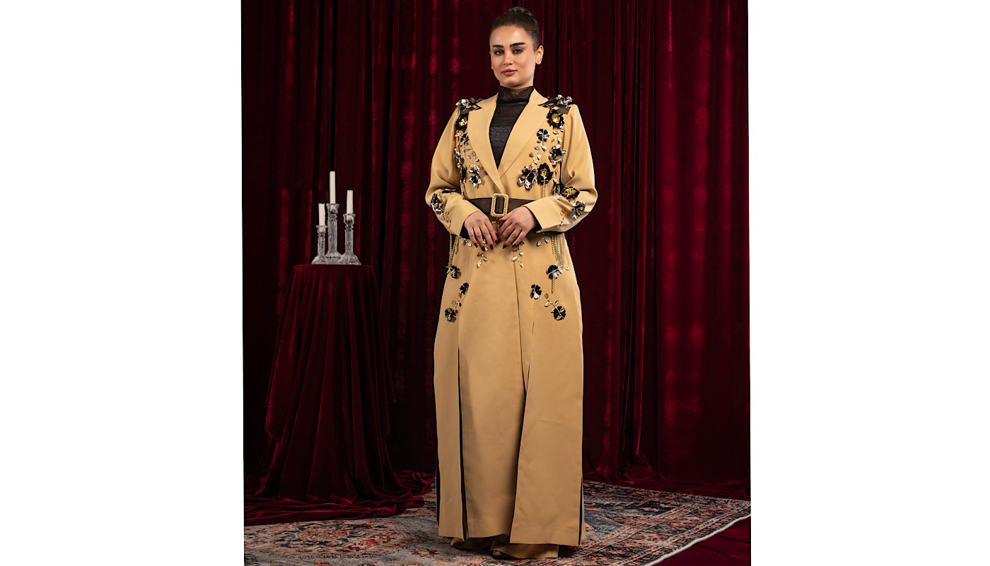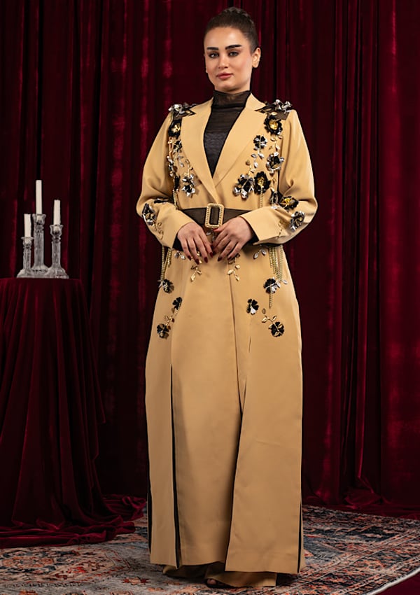 A long blazer with long slits, patterned with unusual and prominent roses, exclusively for Redseal, paired with trousers.