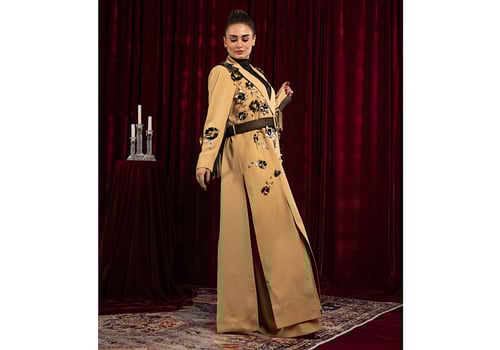 Two-piece model: pants and a wrap t...