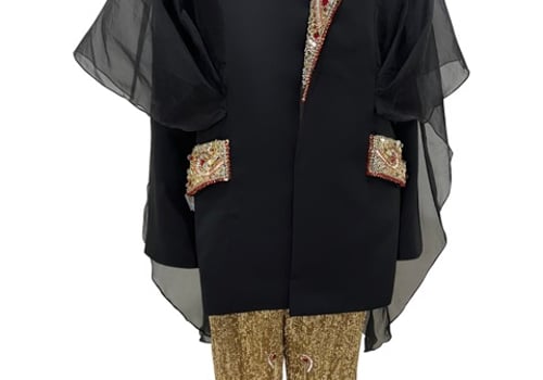 A luxurious embroidered black blazer with a scarf and gold sequin pants