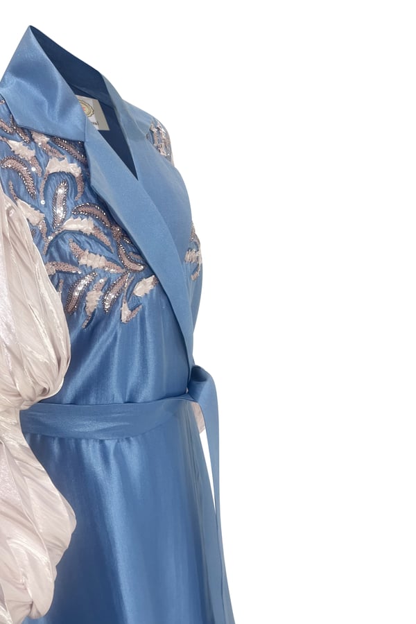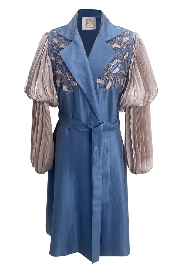 A shirt made of distinctive fabric and uniquely embroidered crystal plissé sleeves on the chest