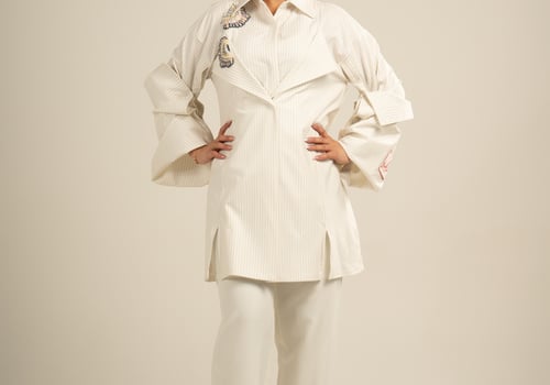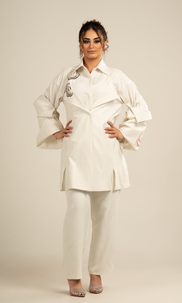 A shirt made of fine crepe, striped, embroidered with threads and beads in a soft and elegant way.