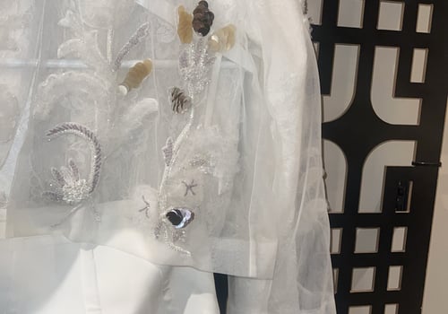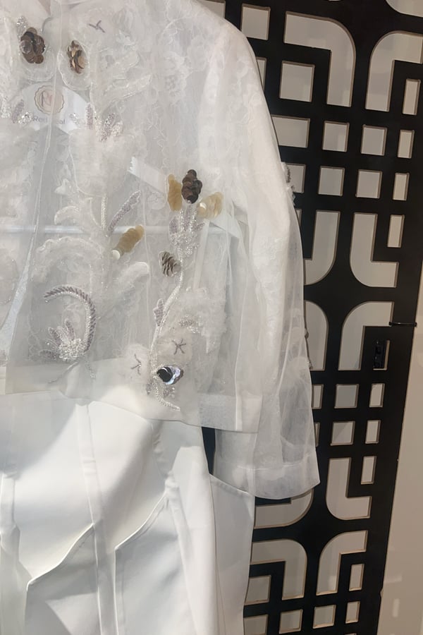 A suit consisting of 3 pieces, a skirt with unique cuts, a lace shirt, and a tortoise top completely embroidered with beads.