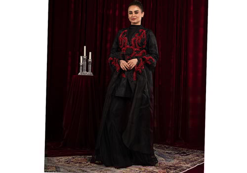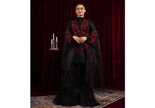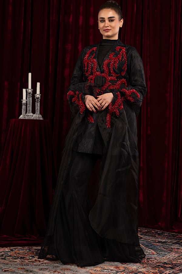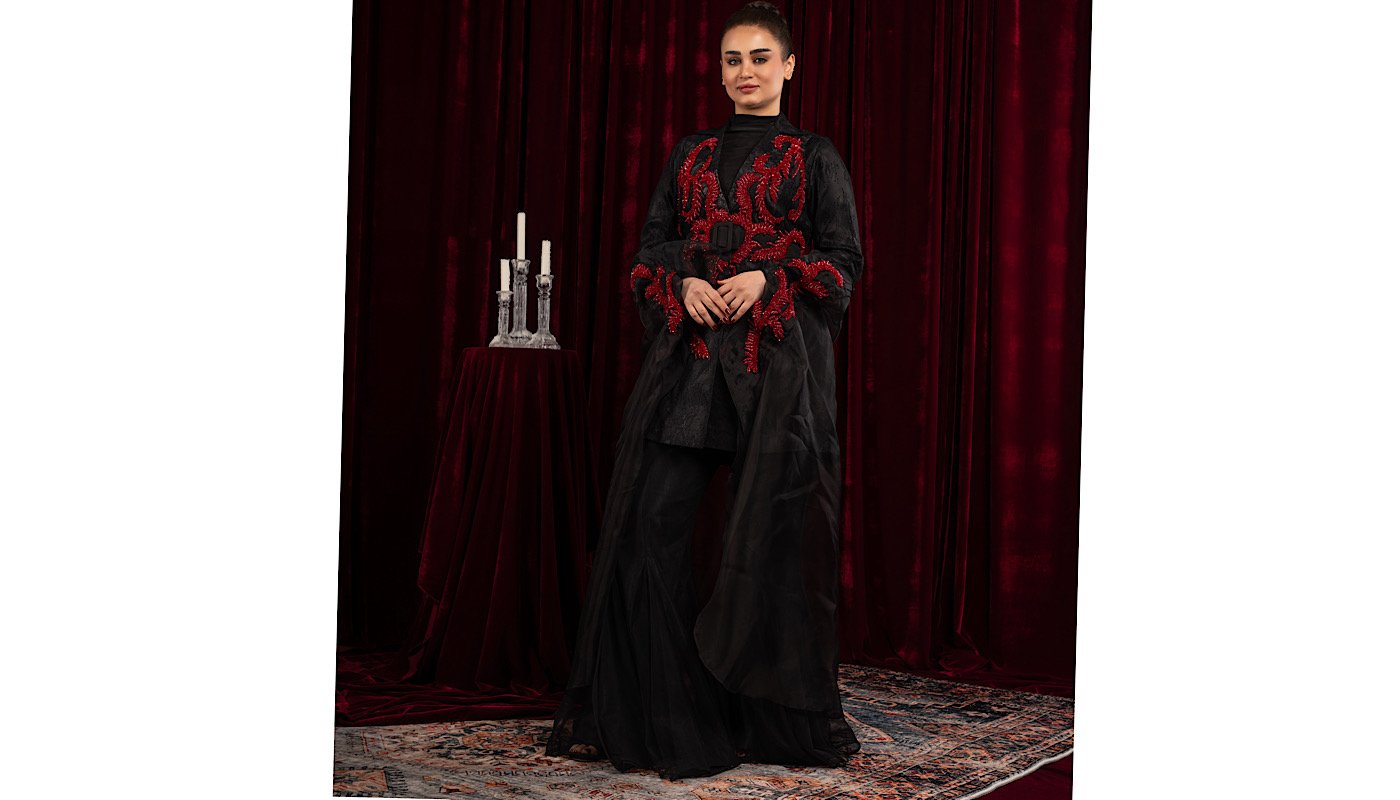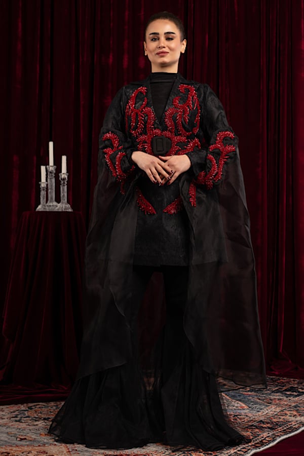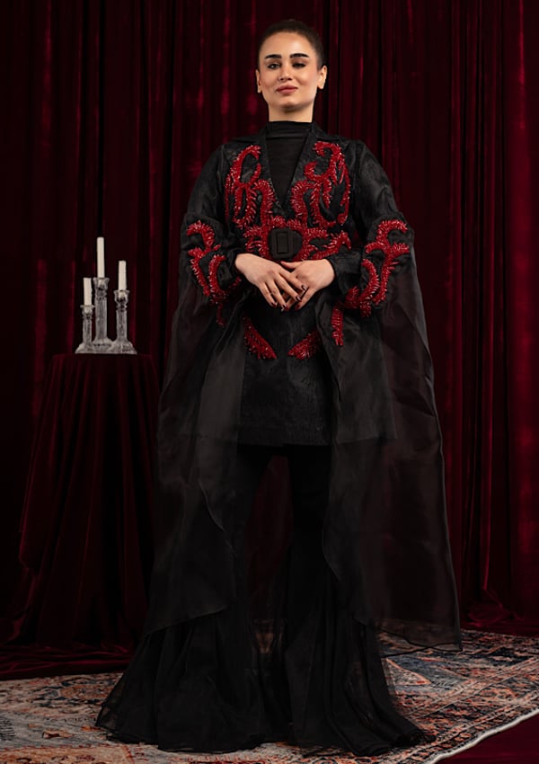 A three-piece suit: a blazer, a scarf with embroidered cuffs, and trousers with unique, hand-stitched details.