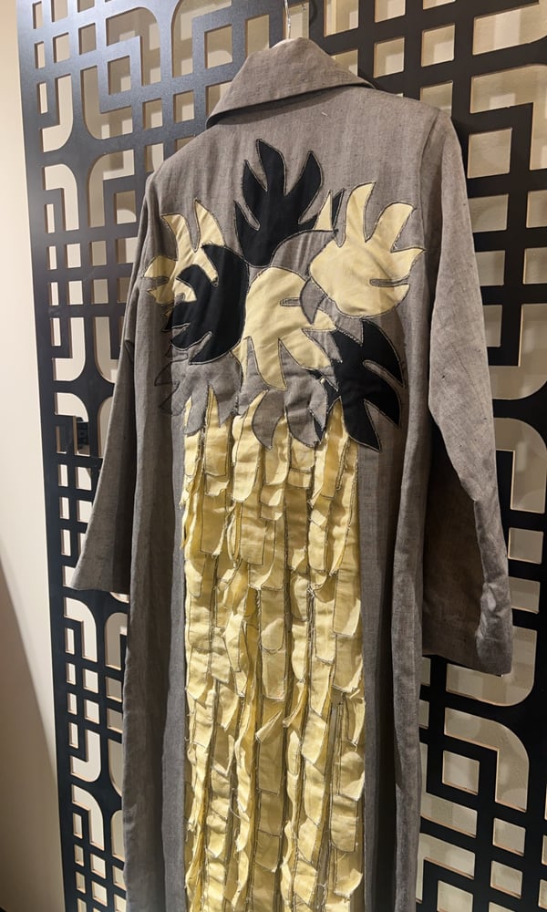 A two-piece set consisting of a T-shirt and a blazer with a belt decorated with strange designs on the back