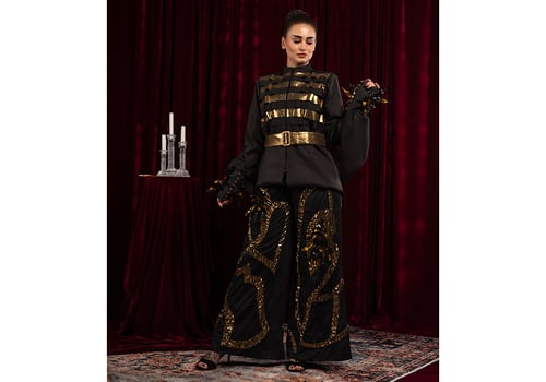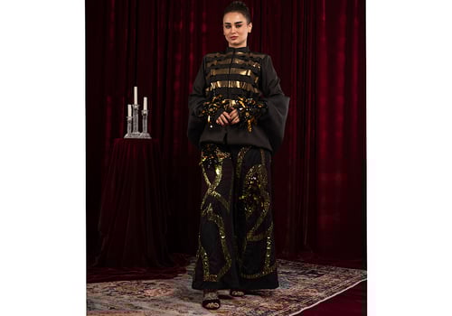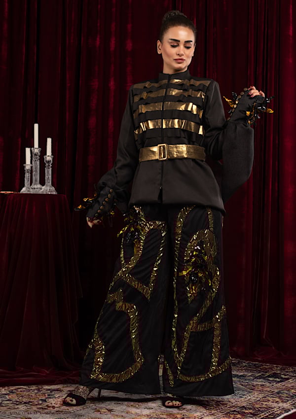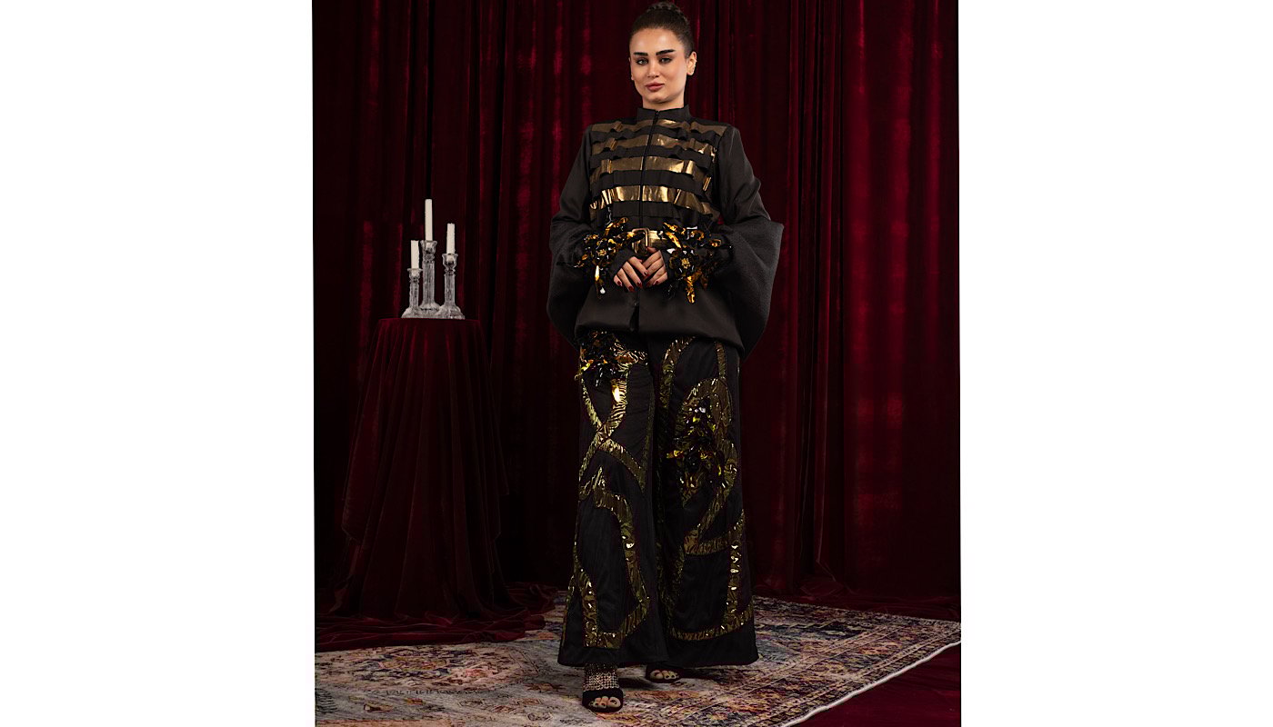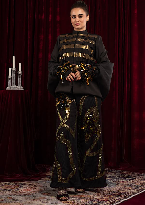 A two-piece suit: a jacket, a scarf draped over the sleeves, and trousers embroidered with unique beading.