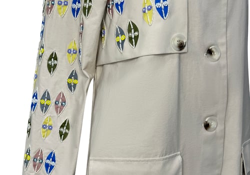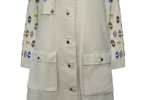 Beige trench coat with beads on the chest and sleeves with buttons
