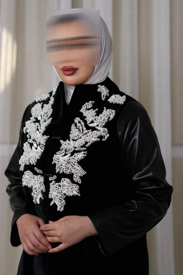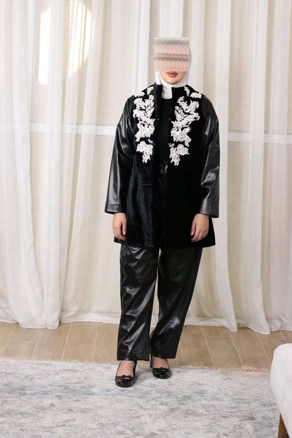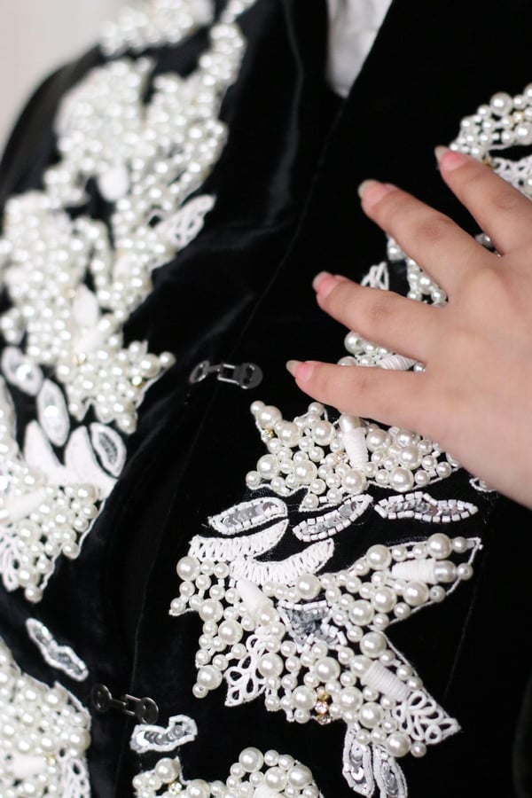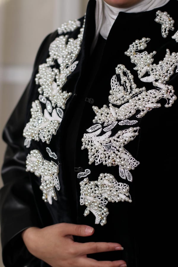 black blazer velvet and leather embroidered with pearls and beads