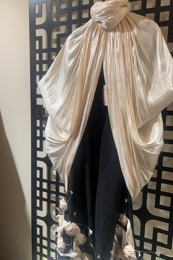 Cream cap with black pants decorated with flowers and feathers at the bottom