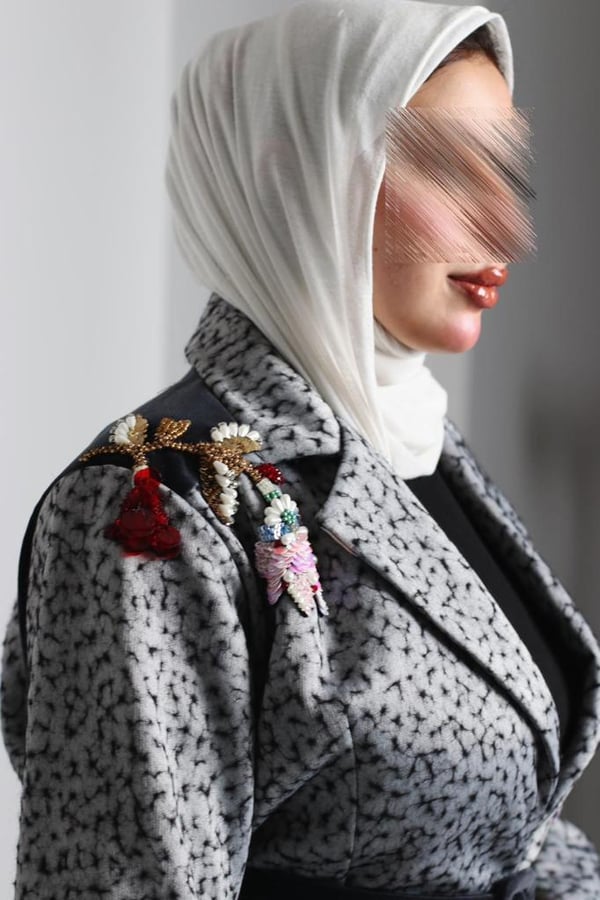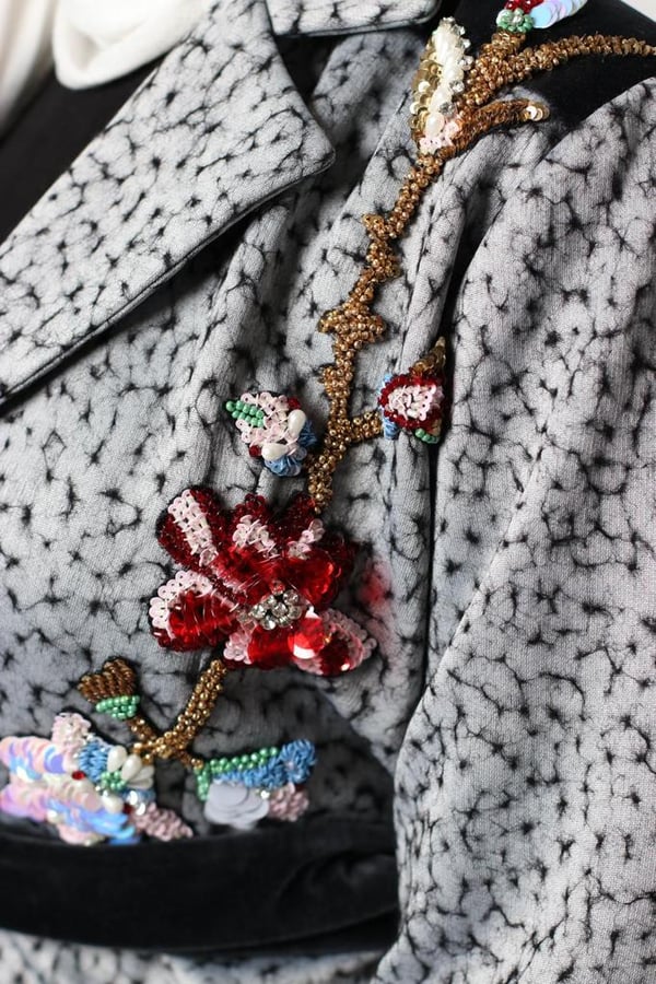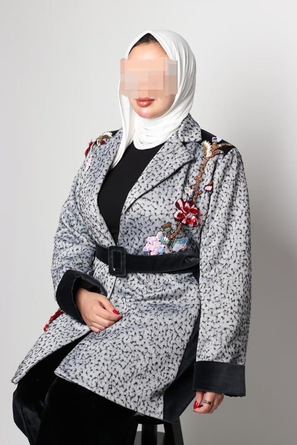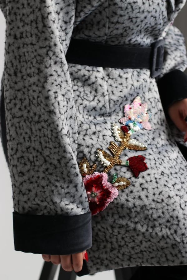 Elegant gray velvet jacket decorated with unique patterns and beads