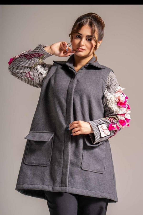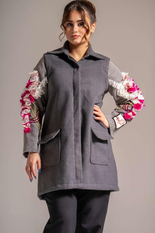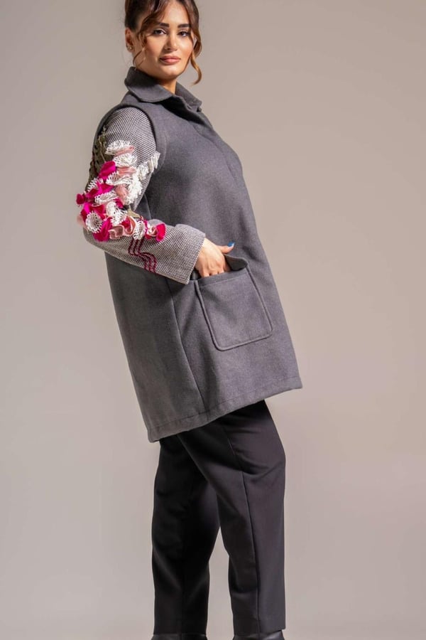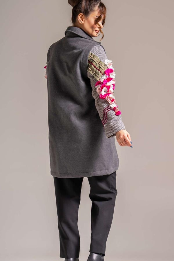 Grey felt shirt with sleeves decorated with threads and raised fabric
