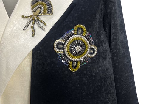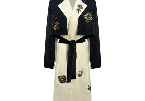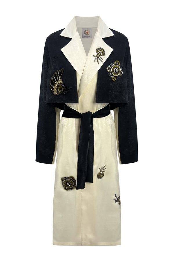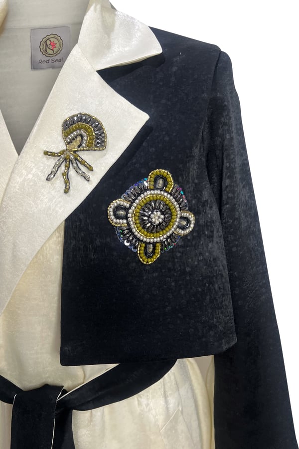 Light crepe of black and cream embroidered with unique patterns and crystals