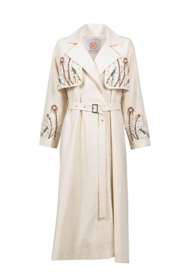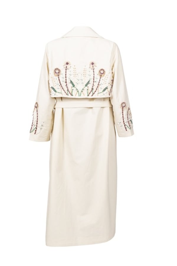 Long blazer embroidered with beads on the front, back and sleeves in trench coat fabric