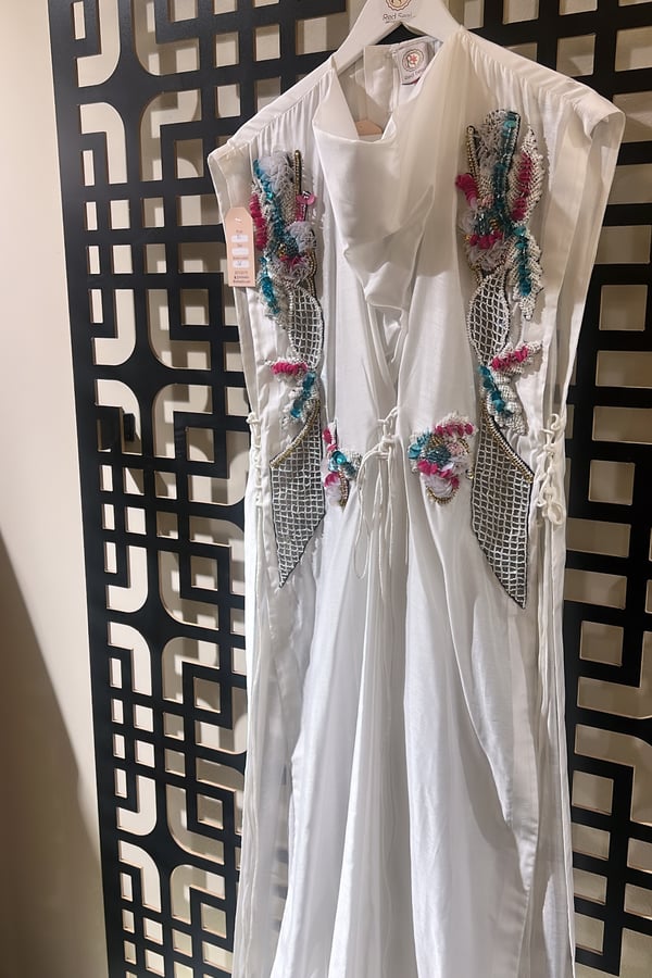 Long gilet, fine fabric, embroidered with various beads, with a tie at the waist
