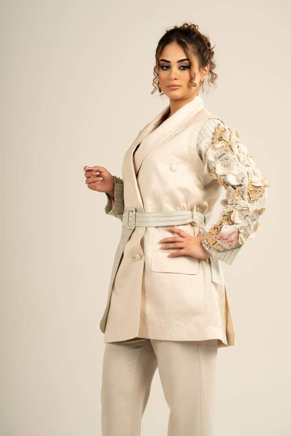 Luxurious striped linen blazer decorated with beautiful patterns, beads and threads on the sleeves