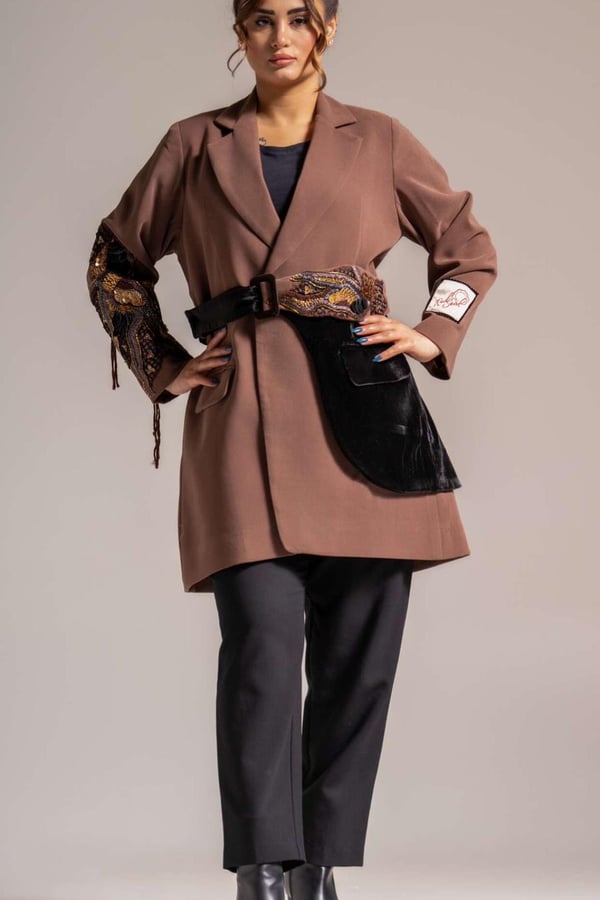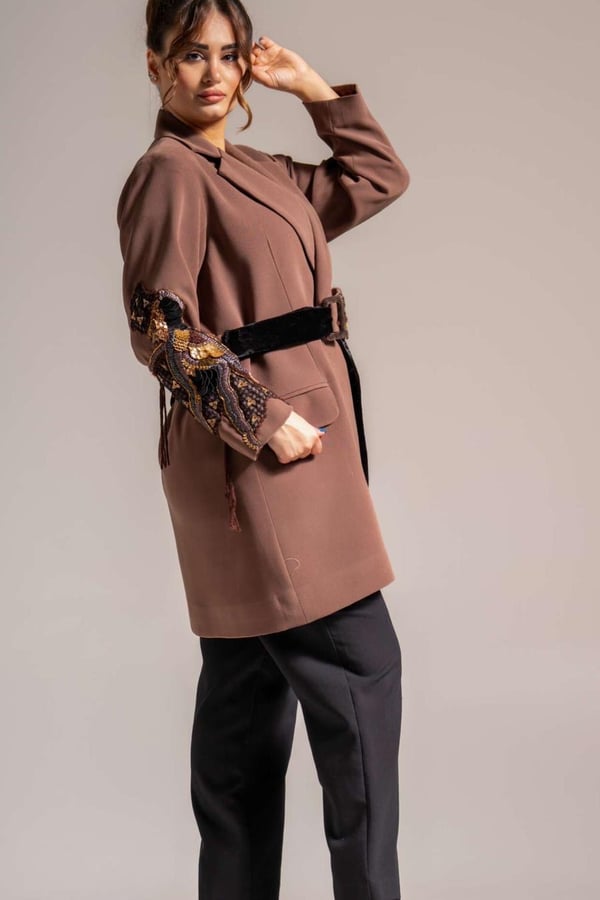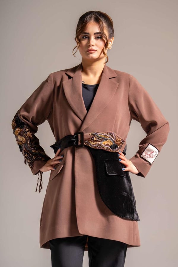 Nude blazer with black velvet embroidered with unique patterns and threads on the sleeves and on the belt