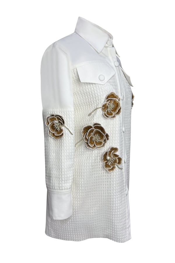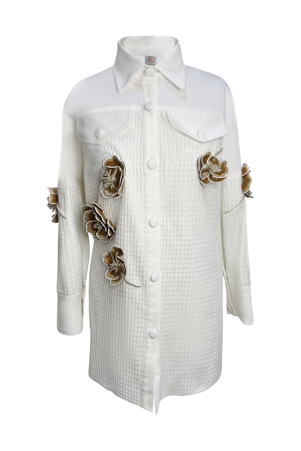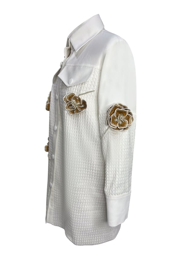 Off-white denim shirt with prominent rose mesh in nude color
