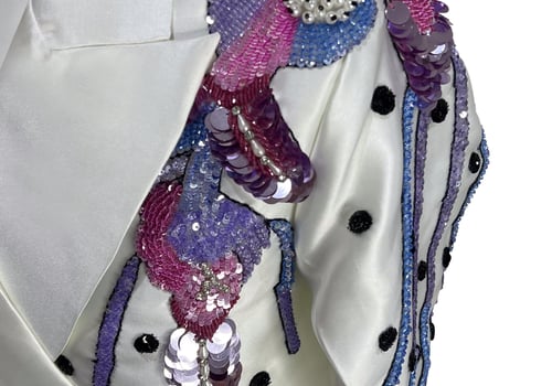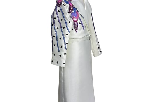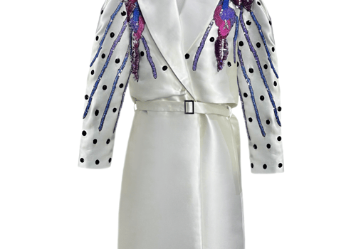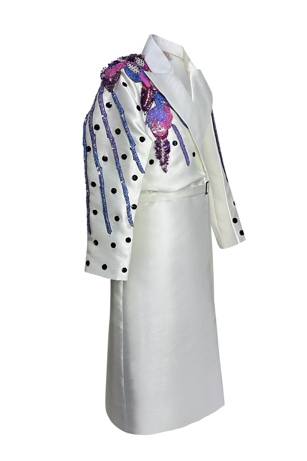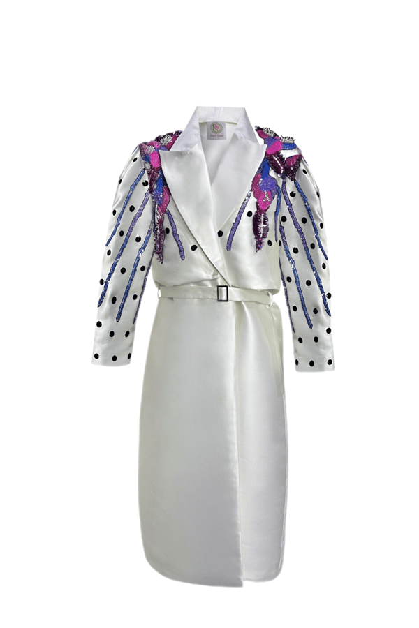Off-white jacket is decorated and embroidered with unique embroidery and features a belt