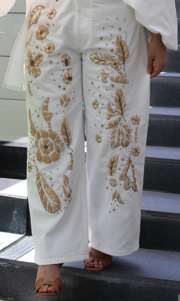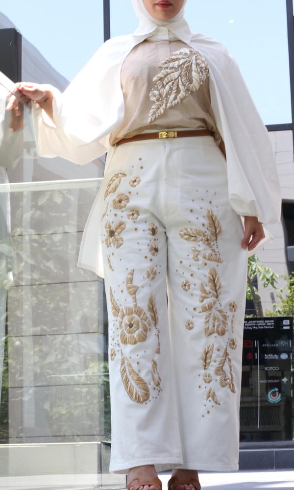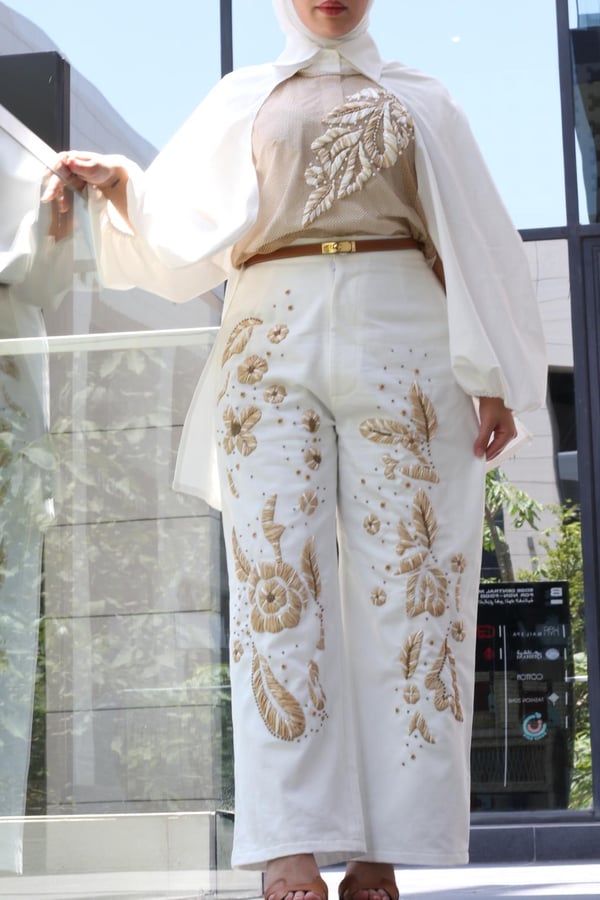 Offwhite jeans embroidered with thread straps and unique patterns with an embroidered cotton and mesh shirt