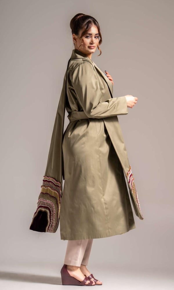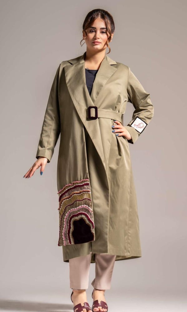 olive trench coat with Unique embroidered scarves in the front and back