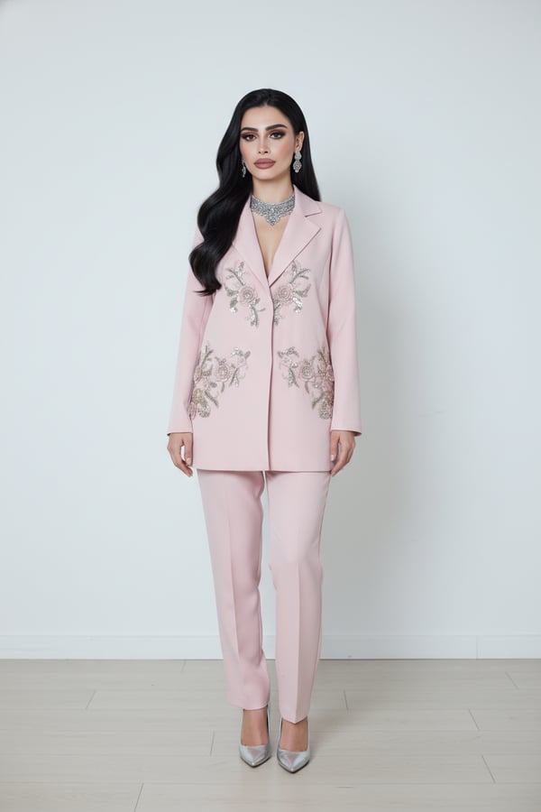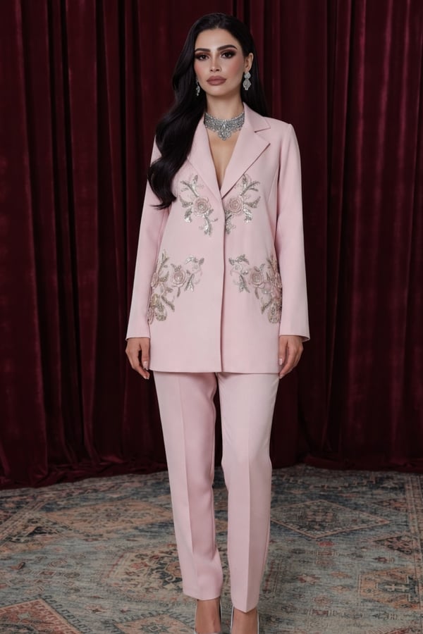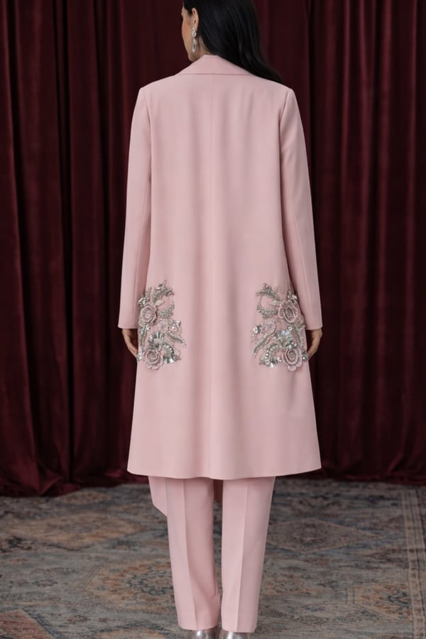 Pink blazer, short in the front and long in the back, fully scuffed on the chest, front and back, no pants.