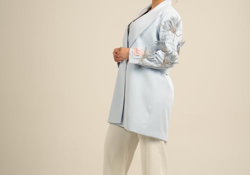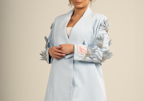 Sky blue blazer decorated and embroidered with prominent roses and beads in a unique and modern
