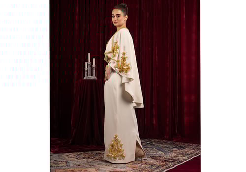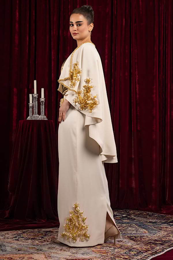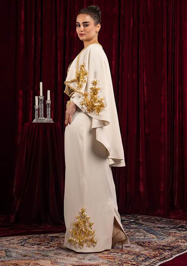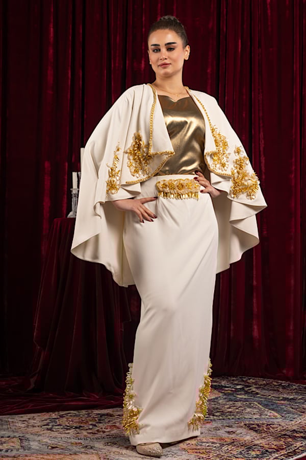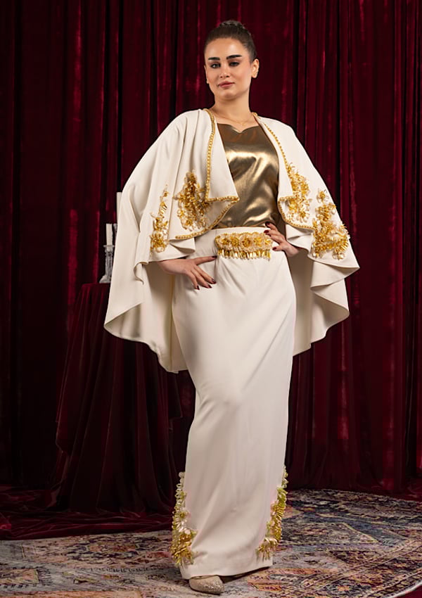 Three-piece suit: cape, undershirt, and skirt, all fully embroidered with unique, hand-stitched details.