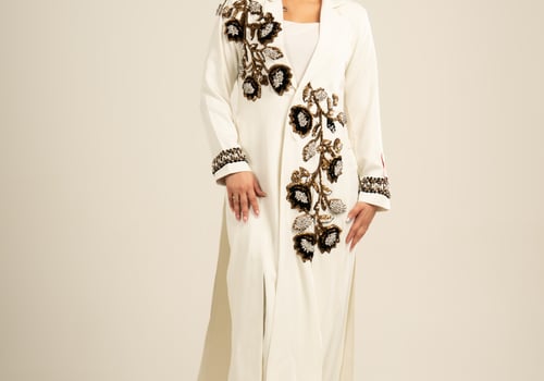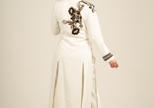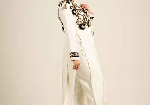 Two-piece set, long coat and pants, made of fine fabric, embroidered with elegant patterns and crystals on the entire back and front.