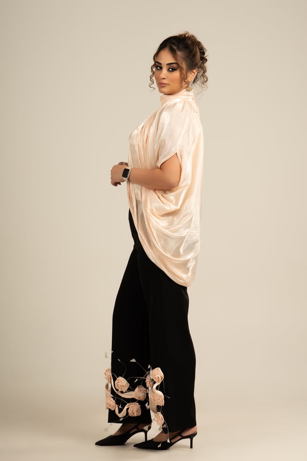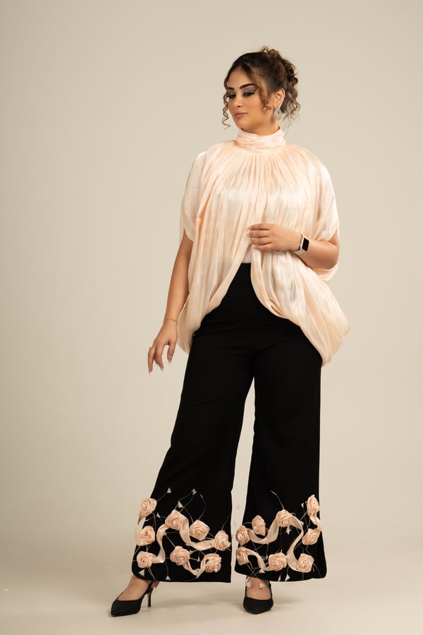 Two-piece suit, pants and top decorated with flowers at the bottom