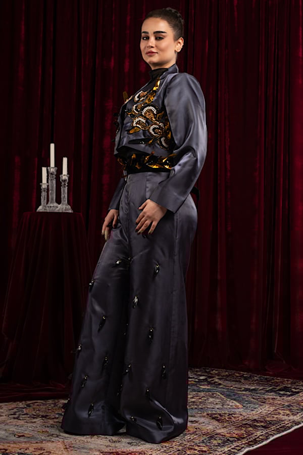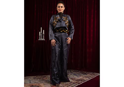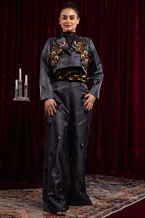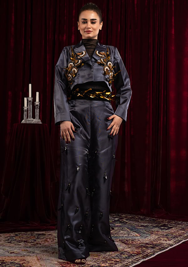 Wide-leg trousers in questionable materials exclusive to Redseal, paired with a belt and questionable cropped jacket.